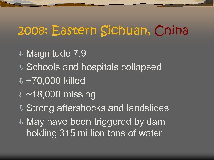 2008: Eastern Sichuan, China ò Magnitude 7. 9 ò Schools and hospitals collapsed ò ~70, 000 killed ò ~18, 000 missing ò Strong aftershocks and landslides ò May have been triggered by dam holding 315 million tons of water