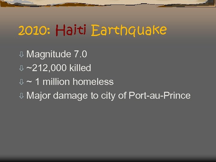 2010: Haiti Earthquake ò Magnitude 7. 0 ò ~212, 000 killed ò ~ 1 million homeless ò Major damage to city of Port-au-Prince