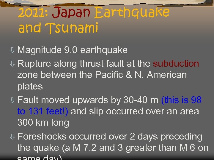 2011: Japan Earthquake and Tsunami ò Magnitude 9. 0 earthquake ò Rupture along thrust fault at the subduction zone between the Pacific & N. American plates ò Fault moved upwards by 30 -40 m (this is 98 to 131 feet!) and slip occurred over an area 300 km long ò Foreshocks occurred over 2 days preceding the quake (a M 7. 2 and 3 greater than M 6 on