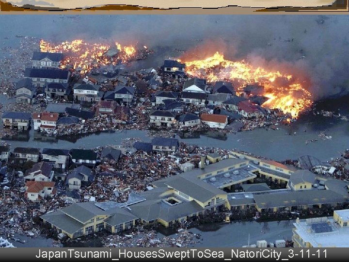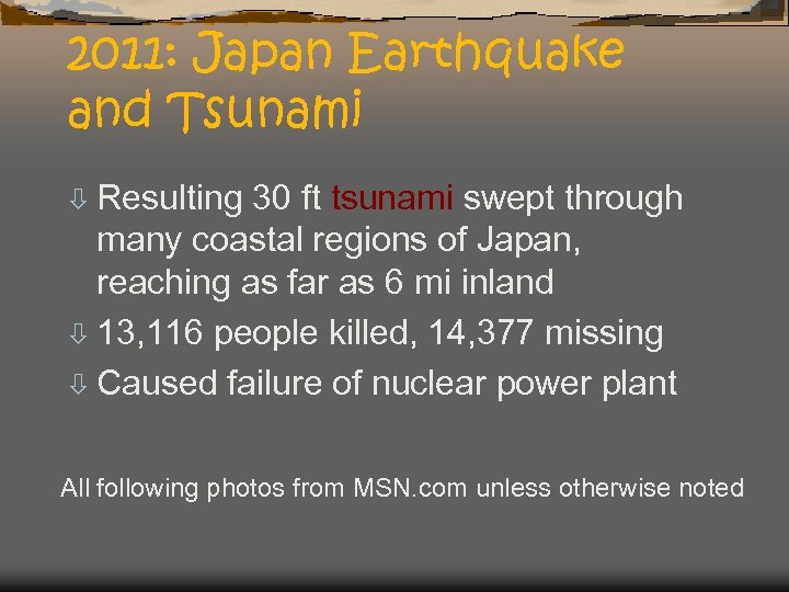 2011: Japan Earthquake and Tsunami ò Resulting 30 ft tsunami swept through many coastal regions of Japan, reaching as far as 6 mi inland ò 13, 116 people killed, 14, 377 missing ò Caused failure of nuclear power plant All following photos from MSN. com unless otherwise noted