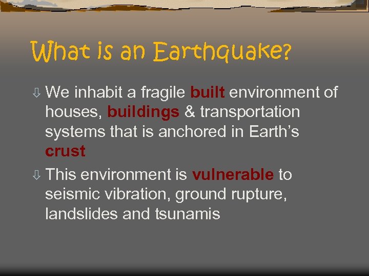 What is an Earthquake? ò We inhabit a fragile built environment of houses, buildings & transportation systems that is anchored in Earth’s crust ò This environment is vulnerable to seismic vibration, ground rupture, landslides and tsunamis