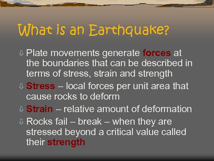 What is an Earthquake? ò Plate movements generate forces at the boundaries that can be described in terms of stress, strain and strength ò Stress – local forces per unit area that cause rocks to deform ò Strain – relative amount of deformation ò Rocks fail – break – when they are stressed beyond a critical value called their strength