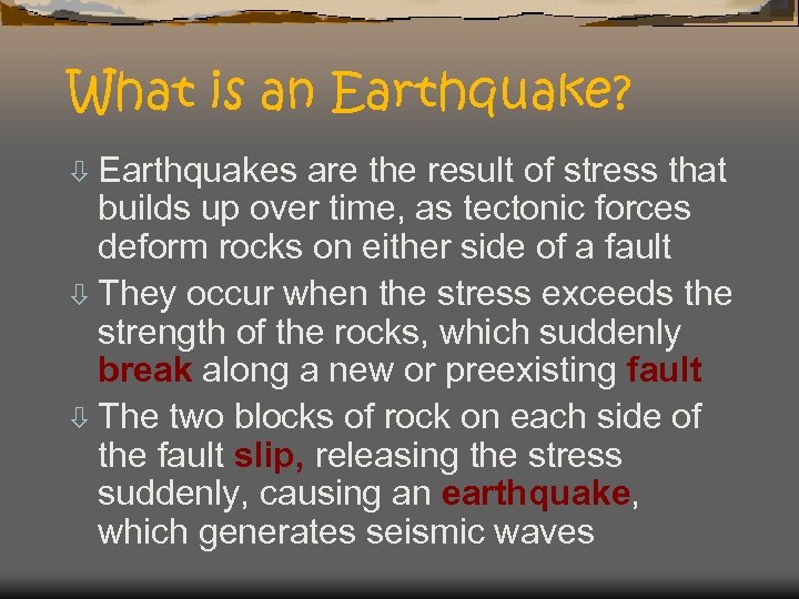 What is an Earthquake? ò Earthquakes are the result of stress that builds up over time, as tectonic forces deform rocks on either side of a fault ò They occur when the stress exceeds the strength of the rocks, which suddenly break along a new or preexisting fault ò The two blocks of rock on each side of the fault slip, releasing the stress suddenly, causing an earthquake, which generates seismic waves