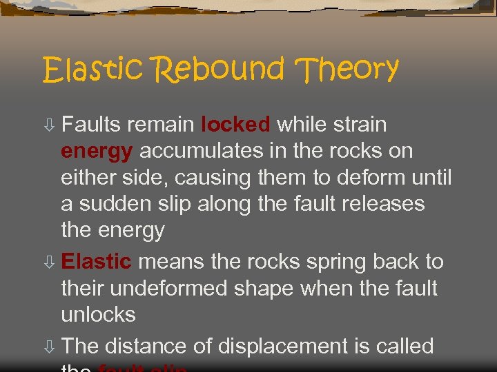 Elastic Rebound Theory ò Faults remain locked while strain energy accumulates in the rocks on either side, causing them to deform until a sudden slip along the fault releases the energy ò Elastic means the rocks spring back to their undeformed shape when the fault unlocks ò The distance of displacement is called