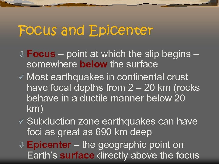 Focus and Epicenter ò Focus – point at which the slip begins – somewhere below the surface ü Most earthquakes in continental crust have focal depths from 2 – 20 km (rocks behave in a ductile manner below 20 km) ü Subduction zone earthquakes can have foci as great as 690 km deep ò Epicenter – the geographic point on Earth’s surface directly above the focus