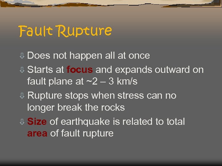 Fault Rupture ò Does not happen all at once ò Starts at focus and expands outward on fault plane at ~2 – 3 km/s ò Rupture stops when stress can no longer break the rocks ò Size of earthquake is related to total area of fault rupture