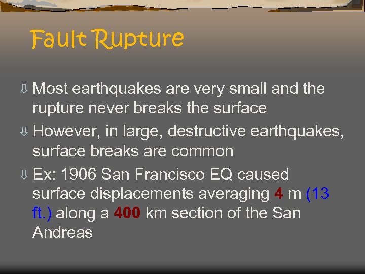 Fault Rupture ò Most earthquakes are very small and the rupture never breaks the surface ò However, in large, destructive earthquakes, surface breaks are common ò Ex: 1906 San Francisco EQ caused surface displacements averaging 4 m (13 ft. ) along a 400 km section of the San Andreas