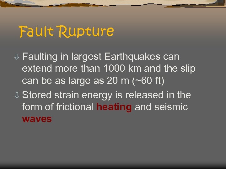 Fault Rupture ò Faulting in largest Earthquakes can extend more than 1000 km and the slip can be as large as 20 m (~60 ft) ò Stored strain energy is released in the form of frictional heating and seismic waves