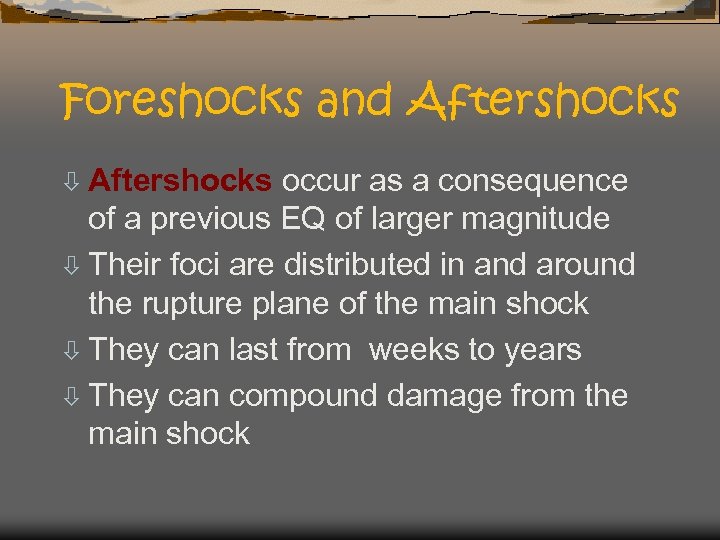 Foreshocks and Aftershocks ò Aftershocks occur as a consequence of a previous EQ of larger magnitude ò Their foci are distributed in and around the rupture plane of the main shock ò They can last from weeks to years ò They can compound damage from the main shock