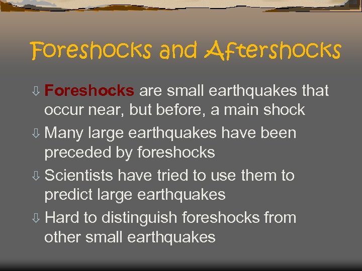 Foreshocks and Aftershocks ò Foreshocks are small earthquakes that occur near, but before, a main shock ò Many large earthquakes have been preceded by foreshocks ò Scientists have tried to use them to predict large earthquakes ò Hard to distinguish foreshocks from other small earthquakes