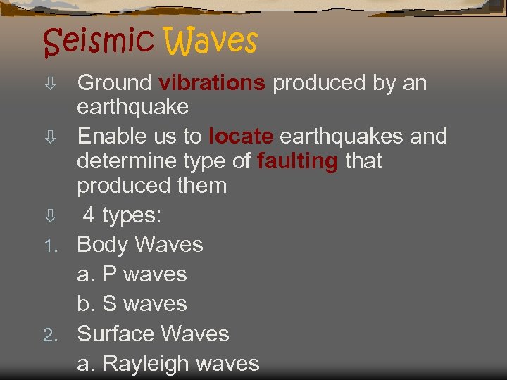 Seismic Waves ò ò ò 1. 2. Ground vibrations produced by an earthquake Enable us to locate earthquakes and determine type of faulting that produced them 4 types: Body Waves a. P waves b. S waves Surface Waves a. Rayleigh waves