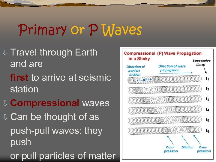 Primary or P Waves ò Travel through Earth and are first to arrive at seismic station ò Compressional waves ò Can be thought of as push-pull waves: they push or pull particles of matter