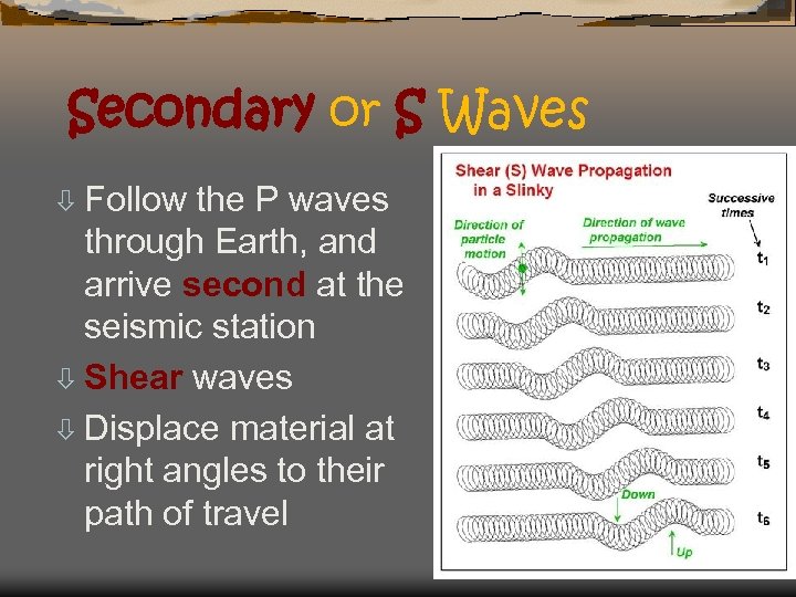 Secondary or S Waves ò Follow the P waves through Earth, and arrive second at the seismic station ò Shear waves ò Displace material at right angles to their path of travel