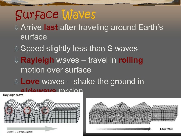 Surface Waves ò Arrive last after traveling around Earth’s surface ò Speed slightly less than S waves ò Rayleigh waves – travel in rolling motion over surface ò Love waves – shake the ground in sideways motion