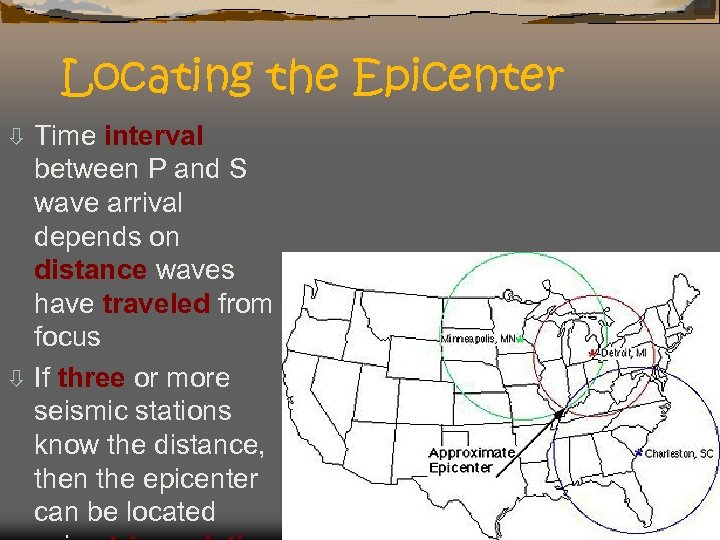 Locating the Epicenter Time interval between P and S wave arrival depends on distance waves have traveled from focus ò If three or more seismic stations know the distance, then the epicenter can be located ò