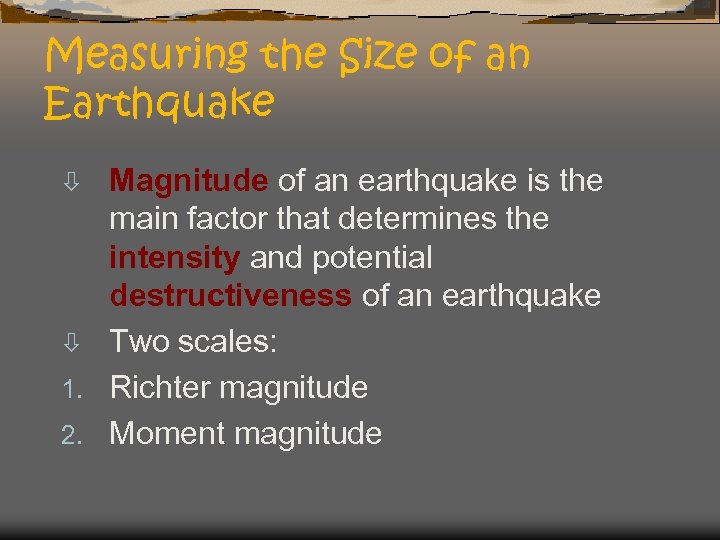Measuring the Size of an Earthquake Magnitude of an earthquake is the main factor that determines the intensity and potential destructiveness of an earthquake ò Two scales: 1. Richter magnitude 2. Moment magnitude ò