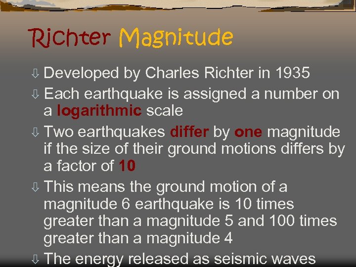 Richter Magnitude ò Developed by Charles Richter in 1935 ò Each earthquake is assigned a number on a logarithmic scale ò Two earthquakes differ by one magnitude if the size of their ground motions differs by a factor of 10 ò This means the ground motion of a magnitude 6 earthquake is 10 times greater than a magnitude 5 and 100 times greater than a magnitude 4 ò The energy released as seismic waves