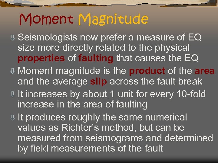 Moment Magnitude ò Seismologists now prefer a measure of EQ size more directly related to the physical properties of faulting that causes the EQ ò Moment magnitude is the product of the area and the average slip across the fault break ò It increases by about 1 unit for every 10 -fold increase in the area of faulting ò It produces roughly the same numerical values as Richter’s method, but can be measured from seismograms and determined by field measurements of the fault