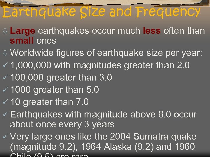Earthquake Size and Frequency ò Large earthquakes occur much less often than small ones ò Worldwide figures of earthquake size per year: ü 1, 000 with magnitudes greater than 2. 0 ü 100, 000 greater than 3. 0 ü 1000 greater than 5. 0 ü 10 greater than 7. 0 ü Earthquakes with magnitude above 8. 0 occur about once every 3 years ü Very large ones like the 2004 Sumatra quake (magnitude 9. 2), 1964 Alaska (9. 2) and 1960
