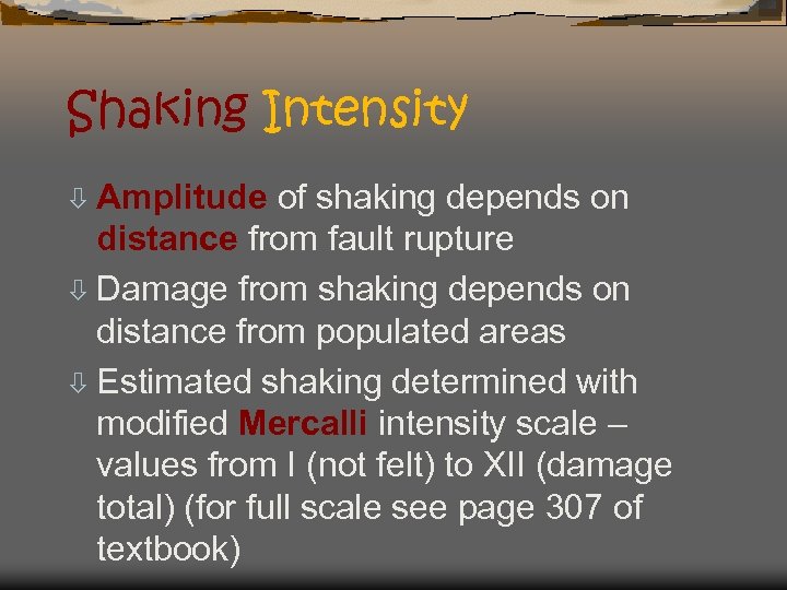 Shaking Intensity ò Amplitude of shaking depends on distance from fault rupture ò Damage from shaking depends on distance from populated areas ò Estimated shaking determined with modified Mercalli intensity scale – values from I (not felt) to XII (damage total) (for full scale see page 307 of textbook)
