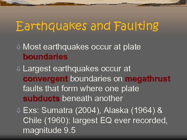 Earthquakes and Faulting ò Most earthquakes occur at plate boundaries ò Largest earthquakes occur at convergent boundaries on megathrust faults that form where one plate subducts beneath another ò Exs: Sumatra (2004), Alaska (1964) & Chile (1960): largest EQ ever recorded, magnitude 9. 5