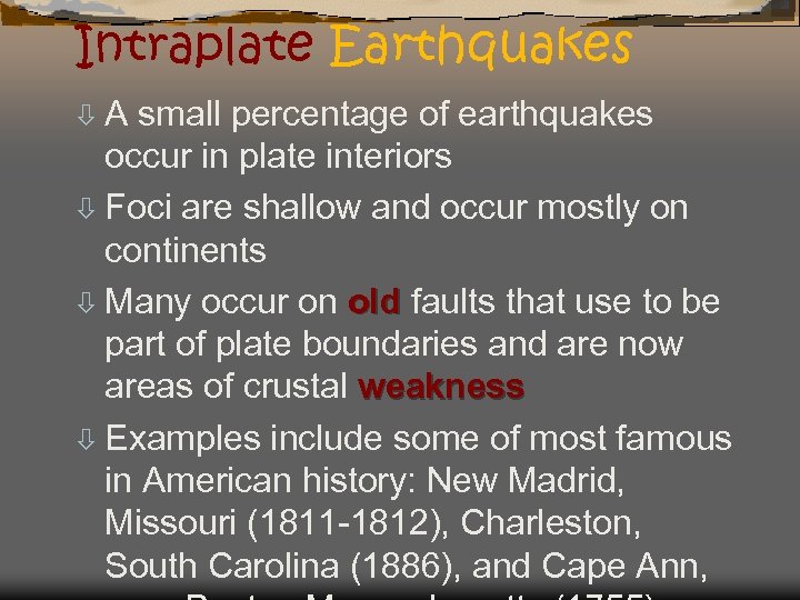 Intraplate Earthquakes òA small percentage of earthquakes occur in plate interiors ò Foci are shallow and occur mostly on continents ò Many occur on old faults that use to be part of plate boundaries and are now areas of crustal weakness ò Examples include some of most famous in American history: New Madrid, Missouri (1811 -1812), Charleston, South Carolina (1886), and Cape Ann,