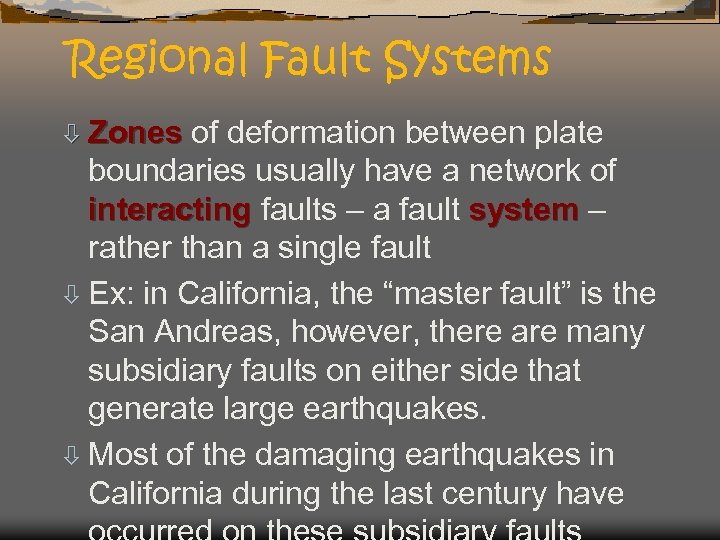 Regional Fault Systems ò Zones of deformation between plate boundaries usually have a network of interacting faults – a fault system – rather than a single fault ò Ex: in California, the “master fault” is the San Andreas, however, there are many subsidiary faults on either side that generate large earthquakes. ò Most of the damaging earthquakes in California during the last century have
