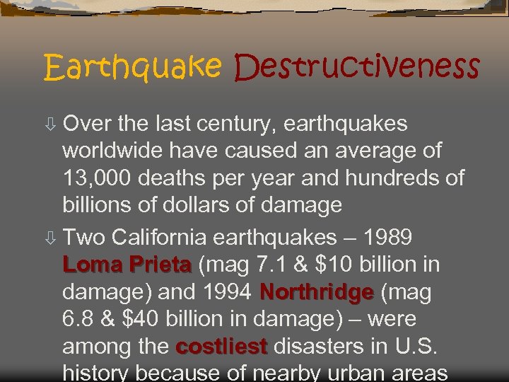 Earthquake Destructiveness ò Over the last century, earthquakes worldwide have caused an average of 13, 000 deaths per year and hundreds of billions of dollars of damage ò Two California earthquakes – 1989 Loma Prieta (mag 7. 1 & $10 billion in damage) and 1994 Northridge (mag 6. 8 & $40 billion in damage) – were among the costliest disasters in U. S. history because of nearby urban areas
