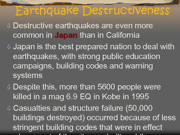 Earthquake Destructiveness ò Destructive earthquakes are even more common in Japan than in California ò Japan is the best prepared nation to deal with earthquakes, with strong public education campaigns, building codes and warning systems ò Despite this, more than 5600 people were killed in a mag 6. 9 EQ in Kobe in 1995 ò Casualties and structure failure (50, 000 buildings destroyed) occurred because of less stringent building codes that were in effect