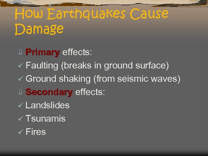 How Earthquakes Cause Damage ò Primary effects: ü Faulting (breaks in ground surface) ü Ground shaking (from seismic waves) ò Secondary effects: ü Landslides ü Tsunamis ü Fires