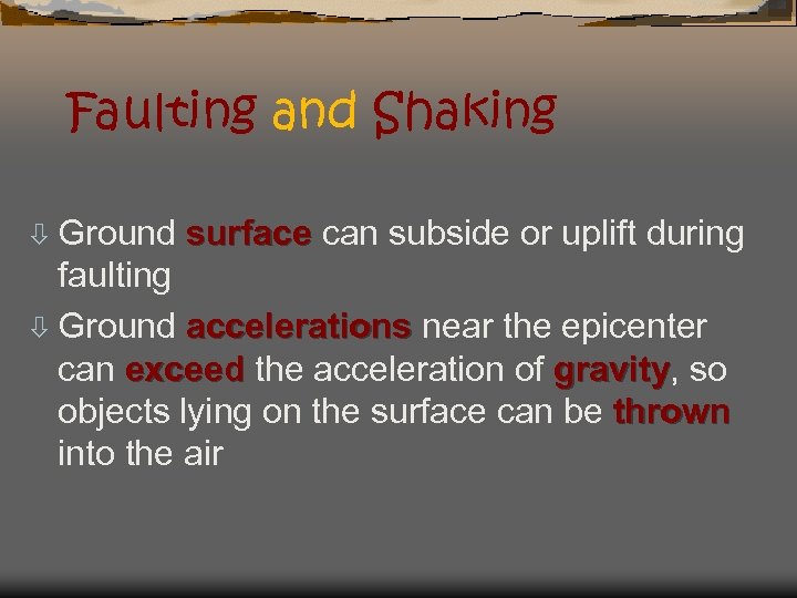Faulting and Shaking ò Ground surface can subside or uplift during faulting ò Ground accelerations near the epicenter can exceed the acceleration of gravity, so gravity objects lying on the surface can be thrown into the air