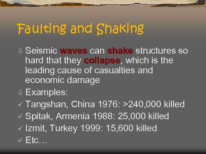 Faulting and Shaking ò Seismic waves can shake structures so hard that they collapse, which is the collapse leading cause of casualties and economic damage ò Examples: ü Tangshan, China 1976: >240, 000 killed ü Spitak, Armenia 1988: 25, 000 killed ü Izmit, Turkey 1999: 15, 600 killed ü Etc…