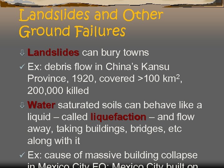 Landslides and Other Ground Failures ò Landslides can bury towns ü Ex: debris flow in China’s Kansu Province, 1920, covered >100 km 2, 200, 000 killed ò Water saturated soils can behave like a liquid – called liquefaction – and flow away, taking buildings, bridges, etc along with it ü Ex: cause of massive building collapse