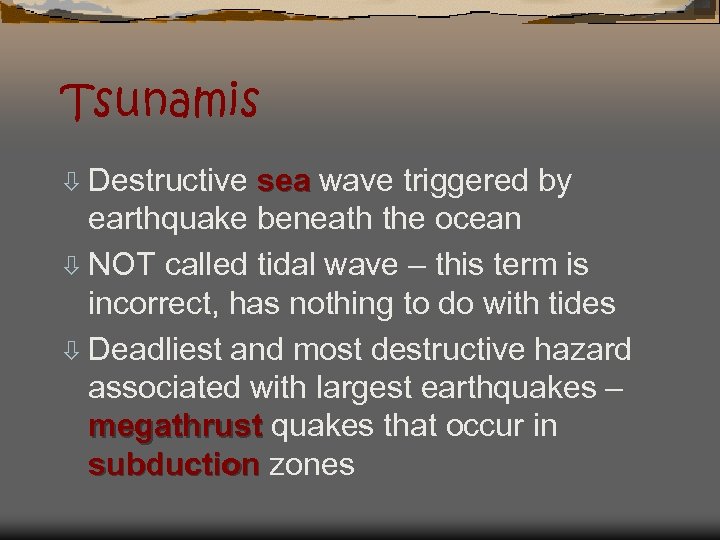 Tsunamis ò Destructive sea wave triggered by earthquake beneath the ocean ò NOT called tidal wave – this term is incorrect, has nothing to do with tides ò Deadliest and most destructive hazard associated with largest earthquakes – megathrust quakes that occur in subduction zones