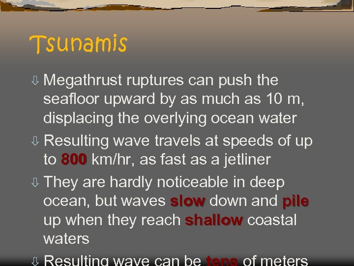 Tsunamis ò Megathrust ruptures can push the seafloor upward by as much as 10 m, displacing the overlying ocean water ò Resulting wave travels at speeds of up to 800 km/hr, as fast as a jetliner ò They are hardly noticeable in deep ocean, but waves slow down and pile up when they reach shallow coastal waters