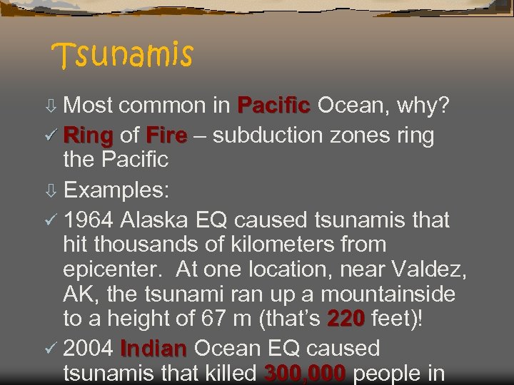 Tsunamis ò Most common in Pacific Ocean, why? ü Ring of Fire – subduction zones ring the Pacific ò Examples: ü 1964 Alaska EQ caused tsunamis that hit thousands of kilometers from epicenter. At one location, near Valdez, AK, the tsunami ran up a mountainside to a height of 67 m (that’s 220 feet)! ü 2004 Indian Ocean EQ caused tsunamis that killed 300, 000 people in