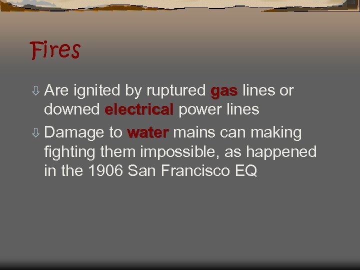 Fires ò Are ignited by ruptured gas lines or downed electrical power lines ò Damage to water mains can making fighting them impossible, as happened in the 1906 San Francisco EQ