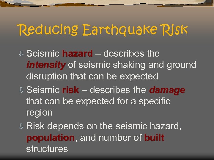 Reducing Earthquake Risk ò Seismic hazard – describes the intensity of seismic shaking and ground disruption that can be expected ò Seismic risk – describes the damage that can be expected for a specific region ò Risk depends on the seismic hazard, population, and number of built population structures