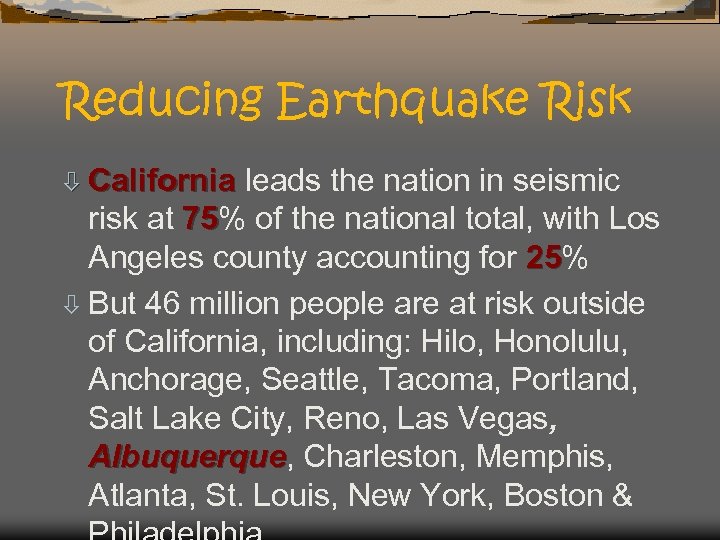 Reducing Earthquake Risk ò California leads the nation in seismic risk at 75% of the national total, with Los 75 Angeles county accounting for 25% 25 ò But 46 million people are at risk outside of California, including: Hilo, Honolulu, Anchorage, Seattle, Tacoma, Portland, Salt Lake City, Reno, Las Vegas, Albuquerque, Charleston, Memphis, Albuquerque Atlanta, St. Louis, New York, Boston &