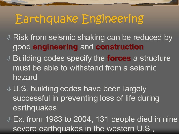 Earthquake Engineering ò Risk from seismic shaking can be reduced by good engineering and construction ò Building codes specify the forces a structure must be able to withstand from a seismic hazard ò U. S. building codes have been largely successful in preventing loss of life during earthquakes ò Ex: from 1983 to 2004, 131 people died in nine severe earthquakes in the western U. S. ,