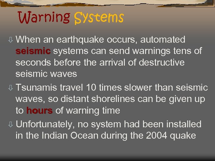 Warning Systems ò When an earthquake occurs, automated seismic systems can send warnings tens of seconds before the arrival of destructive seismic waves ò Tsunamis travel 10 times slower than seismic waves, so distant shorelines can be given up to hours of warning time ò Unfortunately, no system had been installed in the Indian Ocean during the 2004 quake