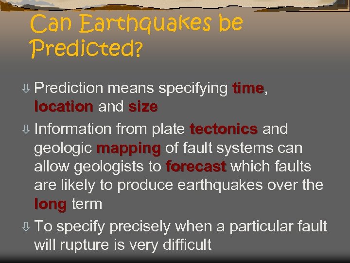 Can Earthquakes be Predicted? ò Prediction means specifying time, time location and size ò Information from plate tectonics and geologic mapping of fault systems can allow geologists to forecast which faults are likely to produce earthquakes over the long term ò To specify precisely when a particular fault will rupture is very difficult