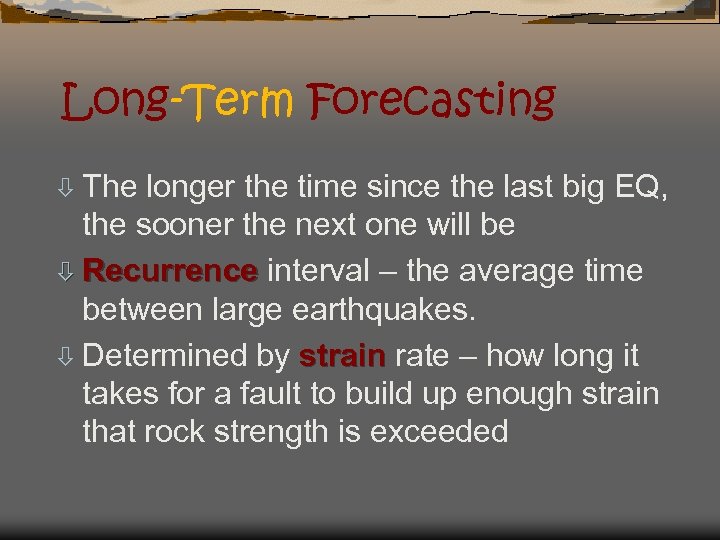 Long-Term Forecasting ò The longer the time since the last big EQ, the sooner the next one will be ò Recurrence interval – the average time between large earthquakes. ò Determined by strain rate – how long it takes for a fault to build up enough strain that rock strength is exceeded