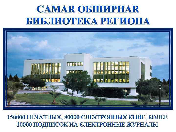 На Кипре есть более 30 университетов, но самый большой и наиболее продвинутый как по качеству образования, известности, так и по развитию - Eastern Mediterranean University, основанный в 1979 году. Ø Ø Ø Ø Ø Международный Университет с государственной аккредитацией; 10 факультетов и три школы предлагающих более 60 различных программы аспирантуры и магистратуры; 34 -х летний опыт работы в области международного образования и прекрасный уровень преподавательского состава; Качественное образование на английском языке; Возможность дополнительного изучения немецкого, французского, испанского, итальянского и греческого языка; 16000 студентов из 70 стран и 1000 преподавателей из 36 стран; Многочисленные международные научные конференции, фестивали и симпозиумы в течении всего учебного года; Научные публикации в более чем 1000 престижных международных журналов; Более 30 научных и технологических исследовательских центров; Современная библиотека с комфортабельными читальными залами общей площадью 7000 м 2, более 130 000 наименований книг и более 820 печатных периодических изданий; Свободный доступ студентов и преподавателей ко всем научным и учебным периодическим изданиям; Международная аккредитация учебных программ; Сотрудничество с более чем 80 вузами в 30 странах мира; Поддержка иностранных студентов; Современные классные комнаты с мощной компьютерной базой и доступом к сети Интернет; Общая полезная площадь помещений 200 000 кв. м. на территории кампуса в 3000 акров земли; Спокойные, комфортабельные и безопасные условия для получения образования; Современное и комфортабельное общежитие; Свыше 50 различных студенческих клубов; Дворец Спорта на 3500 посадочных мест, стадион на 5000 зрителей. Уникальный опыт обучения в самом сердце Средиземноморья
