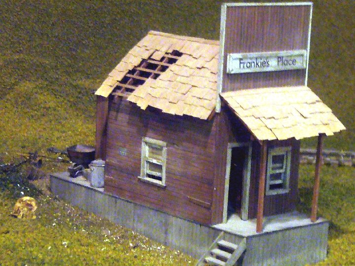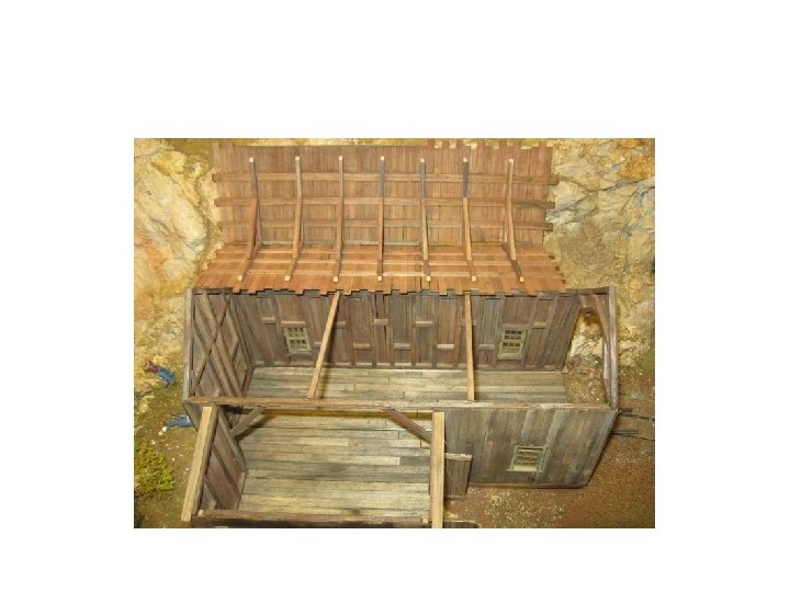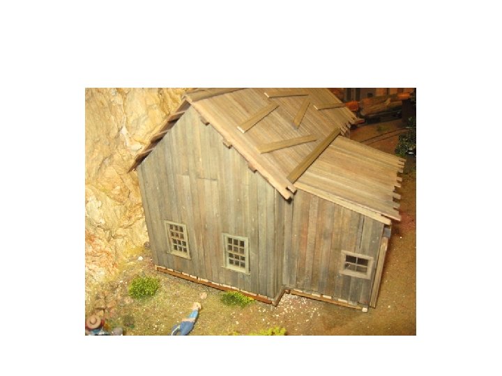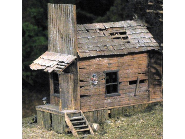 Shacks • • • Notice different colors and textures. Shingles are individual. Nail hole detail. Grain detail. Loose board modeled. Framework. Roof not complete. Windows open. Peeling Paint Knot Holes – now I do knots themselves – use a wood burning set for this or even an old soldering iron. For holes use a wood carving set and gouge out the wood – distress then use black and dark browns around it. • Broken windows.