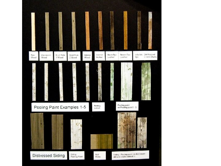 Distressing tools • I could go on for pages but here is a brief list: – Hobby knife with #11 Blades – other blades can be used for special effects. – Wood Distressor – how to build on next slides. – Dental Tools – dental picks can really work well. – Wood burning set with different points – great for knots. – File Cleaner – for files to take out the small filed items in the grooves. – Wire brush – don’t go to cheap here. – BBQ brush – clean unused one. – Fine Toothed modelers saw blade – in handle. – Course sandpaper or emery board. – Other knifes etc. I look for all sorts of unusual items. – Wood carving tools – I use these to gouge out for knot holes.