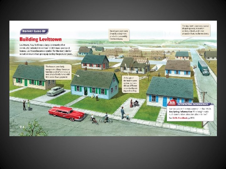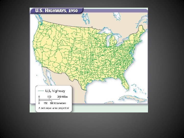 Cultural Changes in the 1950 s New Communities • Levittown was the most famous of the new suburban communities. • The U. S. population was beginning a shift in settlement to the so-called Sunbelt—the southern and western parts of the country. New Highways • During the 1950 s the United States launched the Interstate Highway System—a network of high-speed roads for interstate travel. • This reinforced the United State’s commitment to cars and trucks as its main means of ground transportation.