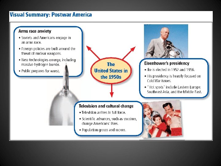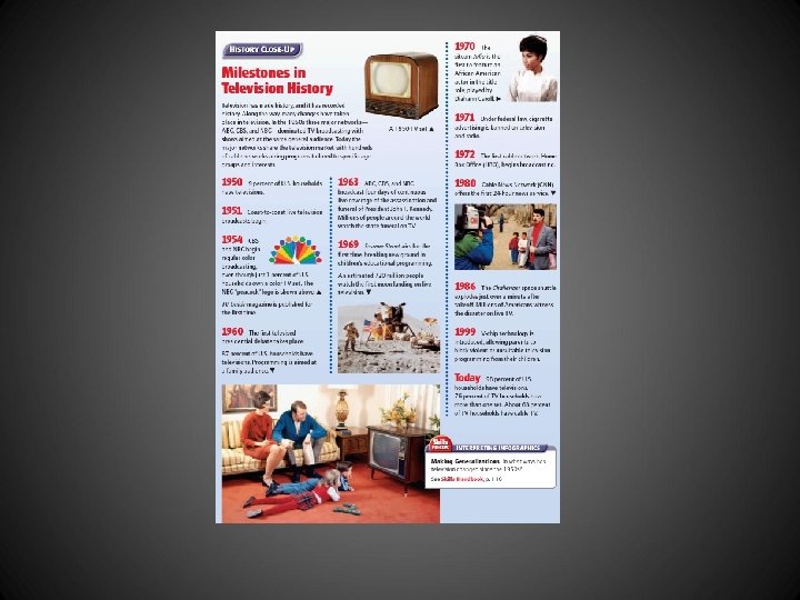 Television in the 1950 s • By the end of World War II, television was ready for home use. • Postwar consumers purchased the new device. – In 1950, 9 percent of U. S. households had televisions. – In 1960, 87 percent of U. S. households had televisions. • Television had an immediate impact on American culture. – On politics – In advertising • Some Americans questioned the effects of television— especially on children.