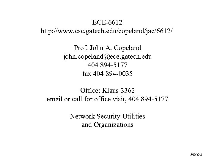 ECE-6612 http: //www. csc. gatech. edu/copeland/jac/6612/ Prof. John A. Copeland john. copeland@ece. gatech. edu 404 894 -5177 fax 404 894 -0035 Office: Klaus 3362 email or call for office visit, 404 894 -5177 Network Security Utilities and Organizations 3/29/2011