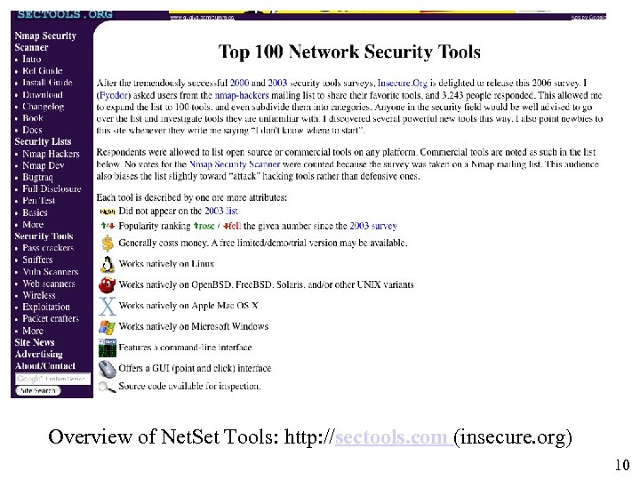Overview of Net. Set Tools: http: //sectools. com (insecure. org) 10